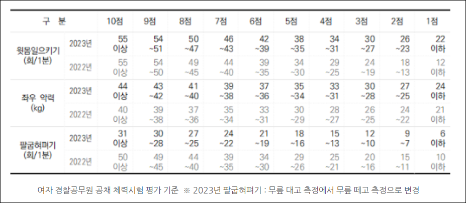 2023년부터 달라지는 경찰 시험 제도 두 번째, 바로 체력 시험 강화입니다. 가장 큰 변화가 여경 수험생들한테 있는데요, 특히 팔굽혀펴기 종목에서 여경 수험생들은 그동안 무릎을 바닥에 대고 측정을 했어요. 그런데 2023년부터 여경 수험생도 남경 수험생과 마찬가지로 양손을 어깨 너비로 벌리고 발을 모은 상태에서 팔은 직각, 몸은 수평이 되도록 하는 자세로 팔굽혀펴기를 시행합니다. 그리고 현재 경찰 체력 시험 종목 5개 중에서 윗몸일으키기, 좌우악력, 팔굽혀펴기 등 3개 종목의 점수 기준이 상향됩니다.