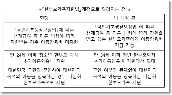 또 추가 아동 양육비 지원이 만 24세 이하 청소년 한부모가 대상이었는데요, 이것이 만 34세로 10살이 늘어난 것입니다. 청년 한부모까지 추가 아동 양육비 지원 대상으로 확대 시키겠다는 내용이고요, 또 하나는 대한민국 국민과 결혼해서 우리나라 국적의 아동을 양육하는 경우에만 다문화 한부모 가족으로 지원을 했었는데요, 개정된 법률에는 '대한민국 국민과 혼인하여'라는 항목이 없어지고 혼인 여부와 관계없이 우리나라 국적의 아동을 양육하면 다문화 한부모 가족 지원의 혜택을 받을 수 있게 되었습니다. 그러니까 과거에는 결혼을 해야만 지원을 받았는데요 이제는 혼인 여부와 관계없이 지원한다는 내용으로 달라진 것입니다.