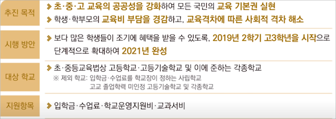 이외에도 정부와 교육부 지자체가 서로 힘을 합해서 고등학교 무상교육을 전 학년으로 확대한다고 합니다. 그러니까 앞으로는 초중고등학교의 교육비를 내지 않고 전부 무상으로 교육을 받을 수 있게 시행이 되는 것인데요, 지원 항목으로는 입학금과 수업료, 학교 운영 지원비와 교과서비, 이 모두를 함께 지원받을 수 있게 된다고 합니다.