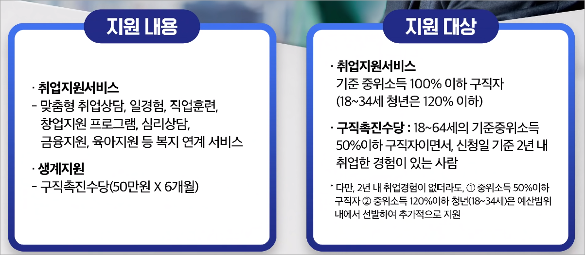 그다음 두 번째는 내년부터 새로 변경되는 복지 제도입니다. 먼저 내년 1월부터 국민 취업 지원 제도가 처음으로 시행이 된다고 하는데요, 국민 취업 지원 제도는 취업에 어려움을 느끼는 청년들과 그리고 경력 단절 여성, 장기 실업자들에게 취업지원 서비스와 생계 지원을 함께 지원해서 취업을 돕는 제도입니다. 그래서 자격 조건을 충족하면 6개월간 월 50만 원을 지원받아서 총 300만 원의 구직 촉진 수당과 취업 지원 서비스도 함께 지원을 받을 수 있게 되고요, 그리고 저소득 예술인과 특수형태 노동자 46만 5천 명에게는 신규로 고용보험료 80퍼센트를 지원한다고 합니다.