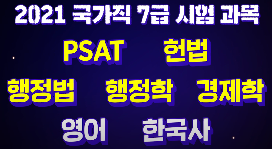 9급 공무원과 7급 공무원의 다른점 두 번째는 바로 필기과목 과목 수입니다. 9급 빼기 7급은 2입니다. 9급은 5과목이고요, 7급은 7과목입니다. 내년 7급 국가직 시험 과목은 7과목이긴 합니다. 영어와 한국사가 검정시험으로 대체가 되었기 때문에 실제 필기시험에서는 PSAT, 헌법, 행정학, 행정법, 경제학 등 5과목이 되는 겁니다. 하지만 영어와 한국사가 준비가 안 되어 있으신 분들은 7과목을 준비해야 하는 것입니다.