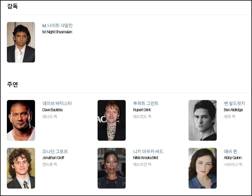 여기서는 바로 데이브 바티스타가 연기했어요. 가디언즈 오브 갤럭시에서 드렉스로 많이 유명하게 알려져 있는 배우인데요. 데이브 바티스타는 정복이 아닌 지도자를 상징합니다. 직업이 학교에서 아이들을 지도하고 코칭하는 역할입니다. 설정 자체를 재밌게 뒤집은 것 같고, 영화 내내 M. 나이트 샤말란 감독이 만들어 온 영화들 속의 장면들이 비슷하게 연출되어 많이 나옵니다. 그런 면에서 M. 나이트 샤말란이 자기의 옛날 영화를 자기가 오마주 한다는 생각이 들기도 했습니다.