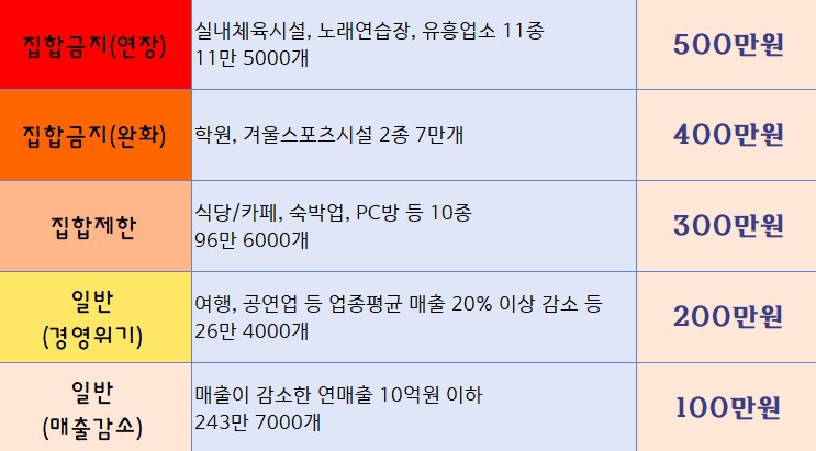 둘째 지원금액도 대폭 늘어납니다. 우선 관광 분야 등을 포함한 일반 업종과 식당 등 집합 제한 업종, 그리고 그리고 실내 체육 시설 등 집합 금지 업종, 이렇게 세단계로 구분하던 지원 기준을 이제는 다섯 단계로 나눠서 지원합니다. 그래서 피해가 클수록 지원액도 함께 늘어나고요 업종별 지원금액은 기존 최대 300만 원에서 500만 원으로 확대해 지급할 예정이라고 하네요. 그리고 자영업자의 전기요금도 모두 감면한다고 발표했습니다. 그래서 4차 재난 지원금을 받는 분들은 기존보다 액수를 높여서 더 넓게 더 두텁게 동시에 지원해서 도움을 드릴 수 있게 최대한 노력하겠다고 발표했습니다.