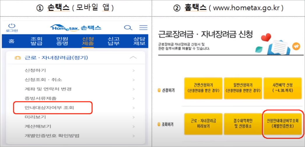 신청 전 확인할 사항이 있는데요, 보통의 경우 안내문을 발송하는데요, 근로장려금, 자녀장려금을 지급받을 가능성이 있는 분들에게는 문자 또는 우편으로 혜택을 받아볼 수 있도록 안내를 하고 있지만 누락되는 경우가 종종 발생되고 있습니다. 스스로 자격이 된다고 생각된다면 검토 후에 신청하시면 되는데요, 모바일 손텍스, 또는 홈텍스를 이용하셔서 편리하게 조회 및 신청을 하실 수 있습니다.