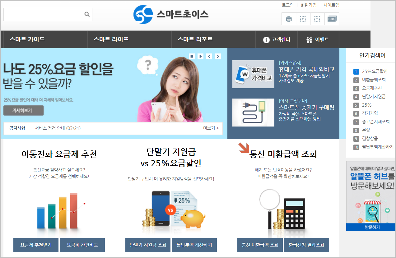 그런데 정산 이후에 과밥요금이라든지 보증금 같은 선납 요금이 발견되는 경우가 있습니다. 이런 경우에는 당연히 고객에게 돌려 줘야 하는데요 안타깝게도 고객이 신청하지 않으면 통신사에서는 알려주지도 않고 돌려 주지도 않습니다. 혹시나 돌려받지 못한 통신비가 없는지 확인하는 방법은 아주 간단한데요, 먼저 포털 사이트에서 '스마트초이스'라 검색을 해주세요.