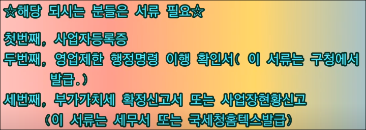 해당 되시는 분들은 서류가 필요합니다. 첫 번째, 사업자등록증 사본, 두 번째, 영업제한 행정명령 이행 확인서(이 서류는 구청에서 발급받으시면 됩니다.) 세 번째, 부가가치세 확정신고서 또는 사업장 현황신고, 이 서류는 세무서 또는 국세청 홈택스에서 발급받으실 수 있습니다.