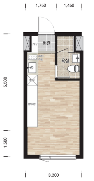 여러 단지가 있지만 그 중에서 홍대 크리원의 방 크기와 구조를 보여드리겠습니다. (모든 형태에 세탁기, 냉장고, 인덕션, 에어컨, 빌트인 가구가 옵션으로 구비되어 있습니다.)