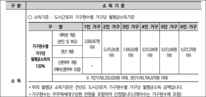 그리고 소득 기준도 충족을 하셔야 되는데요, 도시 근로자 가구원수별 가구당 월평균 소득 기준에 적합해야 합니다. 위의 표를 보시면 대학생 계층, 청년 계층, 신혼부부 계층이 표기되어 있는데요, 각각의 월평균 소득을 초과하시면 안 되겠습니다.