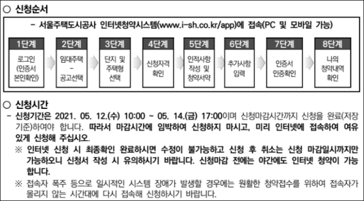 신청 방법에 대해 알아보겠습니다. 신청 방법은 인터넷 서울 주택 공사 인터넷 청약 시스템에 접속을 하셔서 신청을 하시면 되고요, 1단계부터 8단계까지 작성하시면 신청이 완료됩니다. 신청 기간은 2021년 5월 12일부터 5월 14일 17:00 시까지 신청을 완료하셔야 합니다. (아래 그림 참고)