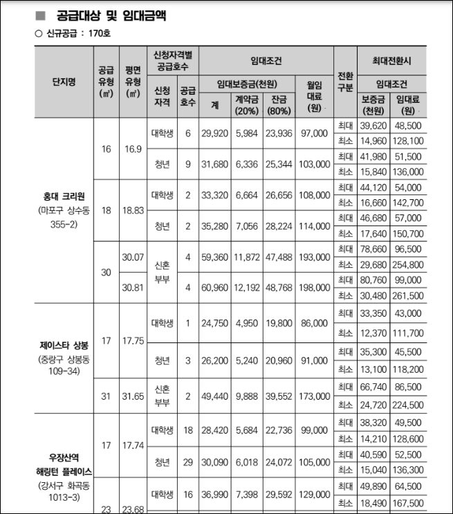 그럼 공급 대상에 따라 임대 금액이 얼마인지 보겠습니다. 단지명이 홍대 크리원, 제이스타 상봉, 우장산역 해링턴 플레이스, 천호역 한강 리슈빌 등 여러개가 있는데요, 보는 방식은 똑같으니까요 홍대 크리원을 한번 살펴보겠습니다.
