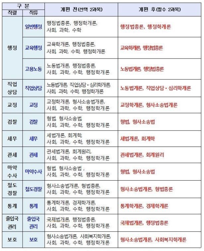 어떻게 보면 이번 과목 개편은 2013년 이전으로 다시 돌아가는 겁니다. 왜냐하면 2014년도에 고교 과목이 들어간 이유가 9급 시험에 고졸자를 많이 늘리겠다는 당시 대통령이었던 이명박 대통령의 한마디 때문이었습니다. 결과적으로 고졸자는 늘지 않았고 오히려 줄어들었고, 세법을 모르는 세무직 공무원, 형법을 모르는 경찰직 공무원 등 공무원의 전문성 하락을 야기했습니다. 세법과 형법을 공무하고 시험을 치러야 하는데 수학과 사회를 시험과목으로 공부했기 때문이죠.