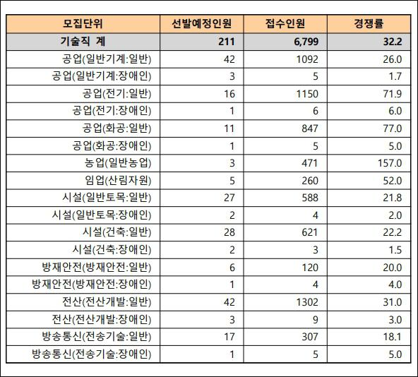 기술직의 경우는 기계직 26대 1, 전기직은 71. 9대 1, 화공직은 77대 1, 농업직은 157대 1, 산림자원직은 52대 1, 토목 직은 21.8대 1, 건축직은 22.2대 1, 방재 안전직은 20대 1, 전산직 전산개발직은 31대 1, 방송통신 전송기술직은 18.1대 1이었습니다.