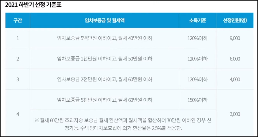 월세 60만 원을 초과하더라도 임차보증금 월세 환산액과 월세액을 합산해서 70만 원 이하인 경우에는 신청이 가능한데요, 예시로 주택 임대차 보호법에 의거해서 환산율 2.5%를 적용했을 때 예를 들면, 보증금 4천만 원 월세 62만 원의 경우에는 총 60만 원으로 신청이 가능합니다. 이럴 경우에는 보증금 월세 환산액이 8만 원이고 여기에 62만 원을 더하면 70만 원이기 때문에 신청이 가능한 겁니다. 임대차 계약서 기준 임차 건물 소재지에 주민등록이 등재돼 있어야 하고요, 반드시 임차인 본인이 신청해야 합니다. 부모, 형제, 친구 등 지인 명의로 임대차 계약을 체결한 경우에는 신청이 불가하다는 점 꼭 체크하시기 바랍니다. 소득 요건은 기준 중위소득 150% 이하인데요, 신청인이 속한 가구당 2021년 건강보험료 부과액 기준으로 기준 중위 소득 150% 이하 세전 기준에 해당해야 하는데, 참고로 2021년 1인 가구 기준 중위 소득 150% 이하 건강보험료 부과액은 직장 가입자는 9만 4467원, 지역 가입자는 6만 9399원입니다.