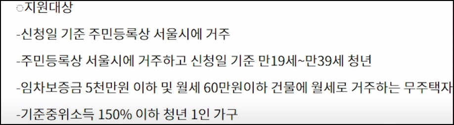 서울시는 소득재산기준 자격요건 적절 여부 의뢰 조사를 거쳐서 10월 중에 최종 지원 대상을 선정 발표한다고 얘기했는데요, 10월 말부터 최대 10개월간 월 20만 원을 격월로 지급한다고 합니다. 지원금을 받는 도중에 타 지역으로 전출을 가거나 월세 없는 전세로 이주를 하거나, 공공 임대 지원을 받는 경우 지원이 중단된다는 점 참고하시기 바랍니다. 자격 요건입니다. 서울 거주 만 19세에서 39세 이하 청년 1인 가구인데요, 주민등록상 만 19세에서 39세 이하인 형제자매 및 동거인 청년이 있는 경우도 지원 대상에 포함이 됩니다. 주민등록상 2인 가구로 셰어하우스 등에 함께 거주하며 임대 사업자와 개별로 임대차 계약을 체결한 경우에는 각각 동시 신청이 가능합니다. 거주 요건인데요, 임차 보증금 5천만 원 이하 월세 60만 원 이하 무주택자입니다.
