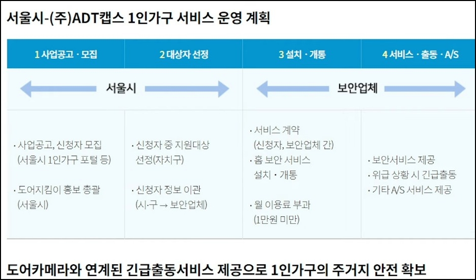 1인 가구가 많이 늘어나면서 불안한 경우가 많이 있죠. 특히 도어 지킴 서비스 정말 필요한데요, 서울시에서 최초 1년 1천 원에 활용할 수 있는 '1인 가구 도어 지킴이 서비스'를 한다는 반가운 소식입니다. 서울시가 ADT 캡스와 손잡고 1인 가구 도어 지킴이 설치 지원 서비스를 하는데요, 바로 안전한 주거환경을 조성하기 위해서 1인 가구의 불안감을 해소하는 사업으로 이 서비스를 준비했다고 합니다. ADT 캡스는 서울시 1인 가구 3천 명에 대해 보안 기기를 설치하고 이와 연계된 긴급 출동 서비스를 제공한다고 하는데요, 해당 서비스를 시중가의 절반 정도 가격으로 공급할 예정이라고 합니다.