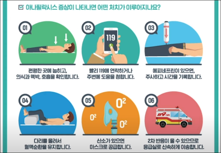 이렇게 표를 보듯이 피부에는 두드러기 가려움증, 호흡기는 코막힘 콧물, 소화기는 복통과 메스꺼움, 신경 같은 경우에는 안절부절못하고 실신을 하시거나 의식이 저하되는 경우가 생기고요, 심혈관은 저혈압, 빠른 맥박, 심장마비 등 이런 증상을 꼭 알아두셔야 합니다. 그렇다면 코로나19 백신 맞은 다음에 이런 증상이 나타나면 어떻게 대응을 해야 될까요. 아나필락시스 대응 방법은 다음과 같습니다. 아나필락시스 증상이 나타나면 첫 번째는 평평한 곳에 눕히고 맥박과 의식, 호흡을 확인합니다. 두 번째 119에 연락하거나 주변에 도움을 청해야 하고요, 세 번째는 에피네프린이 있으면 주사하고 시간을 기록합니다. 다리를 올려서 혈액 순환을 유지하고 산소가 있으면 마스크로 공급하는데요, 2차 반응이 올 수 있으므로 응급실로 신속하게 이동합니다.
