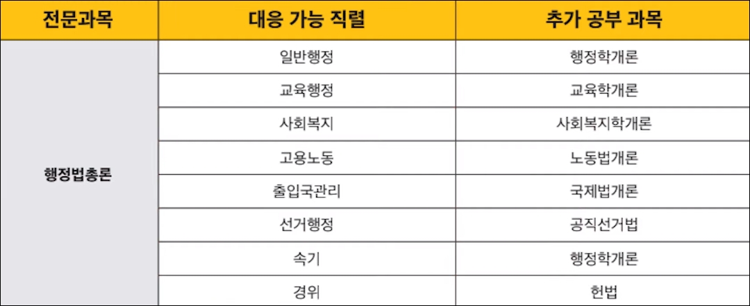 또 형법과 형사소송법 조합의 약점은 지방직에서는 채용하는 직렬이 없다는 점이고요, 대신 공무원 수사직의 시험 과목이 형법과 형사소송법이라서 국가직과 일정이 겹치지 않아 한 번 더 응시할 수는 있습니다. 지금까지 보셨겠지만 생각보다 두 개의 과목으로 여러 직렬을 대비할 수 있는 과목 조합이 많지는 않은데요, 대신에 한 과목만 더 공부하면 여러 직렬을 대비할 수 있는 과목 조합이 있습니다. 대표적인 과목이 행정법 총론입니다. 행정법 총론이 시험 과목인 직렬은 일반 행정을 시작으로 교육 행정, 사회복지, 고용노동, 선거 행정, 출입국 관리, 속기, 경위직 등이 있습니다. 행정법 총론을 선택하면 일반행정직은 행정학 개론, 교육 행정직은 교육학 개론, 고용 노동직은 노동법 개론, 그리고 사회복지직은 사회복지학 개론, 출입국 관리직은 국제법 개론, 경위직은 헌법, 그리고 선거행정직은 공직선거법, 이 과목들을 추가로 공부하시면 대응할 수 있습니다.