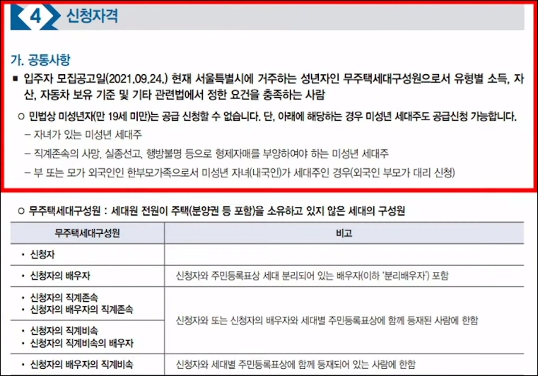 신청 자격입니다. 무주택 세대주 구성원이어야 되고요, 소득 조건과 자산 요건이 있는데요, 소득 요건은 1인 가구 기준으로는 269만 2천468원 이하여야 하고, 4인 가구는 496만 5천944원 이하여야 합니다. 자산 기준은 세대 구성원 전원이 보유하고 있는 모든 총자산이 2억 9천200만 원 이하여야 하고 부채는 자산에서 감액이 됩니다. 자동차가 중요한데요, 개별 자동차 가액이 3496만 원 이하여야 합니다. 청약 통장은 신청자 본인 명의만 유효하고요, 청약 통장 납입 회차는 통장에 나타난 회차 기준이 아닌 청약 통장 순위 확인서의 회차 기준만 인정이 되니까 참고해 주시기 바랍니다. 우선 공급 세부 항목이 있는데요, 노부모 부양자, 장애인, 또 북한 이탈 주민, 중소기업 근로자, 한부모 가족 우대해 드립니다.