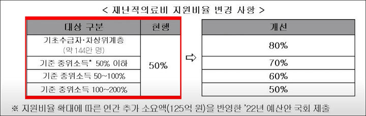 그러니까 위의 표를 보시듯이 기초생활수급자나 차상위 계층, 기준 중위 소득 50% 이하, 기준 중위소득 50%에서 100%, 기준 중위소득 소득 100%에서 200%, 그러니까 소득이나 재산 기준을 따지지 않고 이렇게 지금까지는 일괄적으로 50%를 지원해 오다가, 이제부터 11월부터는 개선되는데요, 기초생활수급자나 차장 계층에 대해서는 지원 비율을 80%까지 높였습니다. 그러니까 앞으로는 재난적 의료비를 더욱더 많이 받을 수 있다, 기준 중위 소득 50% 이하에 대해서는 70%까지 확대하고요, 기준 중에서도 50%에서 100%는 60%로 올리고, 기준 중위소득 100%에서 200% 구간에 계시는 분들은 지금까지 실시했던 것과 변함없이 50%를 그대로 적용합니다.