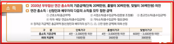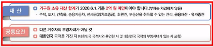소득요건을 알아보겠습니다. 지난해 근로 사업 또는 종교인 소득이 있고, 부부합산 연간 총소득이 기준금액 미만이어야 하는데요, 단독가구는 4만 원~2천만 원 미만, 홑벌이 가구는 최저 4만 원~ 3천만 원 미만, 맞벌이 가구는 600만 원~3600만 원 미만입니다. 재산 요건은 지난해 6월 1일 현재 부동산, 전세금, 자동차, 예금 등 가구원 전체의 재산 합계액이 2억 원 미만이어야 하고 부채는 차감하지 않습니다.