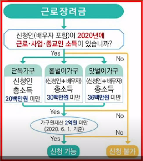 근로장려금, 자녀장려금, 흐름표를 따라가면 내가 대상이 되는지 금방 알 수가 있는데요, 예를 들어서 근로장려금은 신청인이 2020년에 근로사업, 종교 소득이 있을 경우에는 단독 가구냐, 홑벌이 가구냐, 맞벌이 가구냐로 분류가 돼서 여기에서 해당하는 걸 따라가면 가구 재산이 2억 원 미만이냐에 따라서 바로 신청 가능 여부가 판정이 되고요, 자녀 장려금도 역시 그림을 보시고 체크해 주시기 바랍니다.