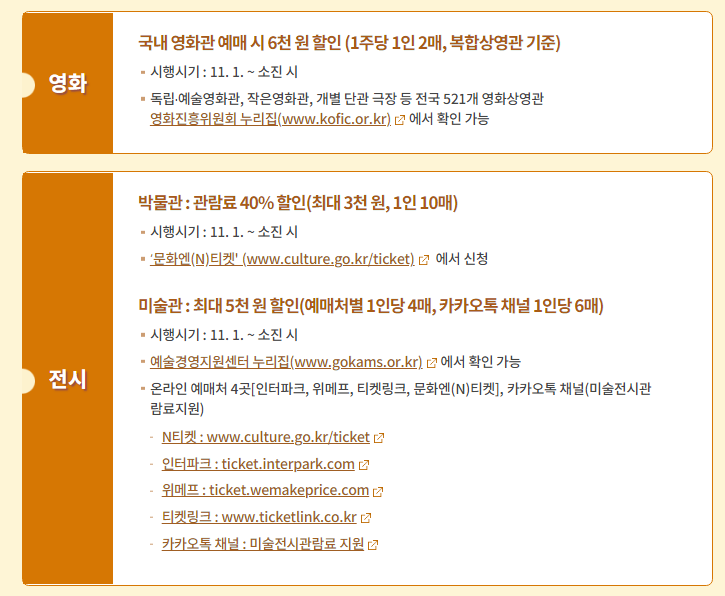 문체부가 7개 분야 소비 할인권 지원 시작을 적극적으로 하기 시작했는데요, 숙박은 예약 시 2~3만 원 할인을 1인 1회 받을 수가 있습니다. 여행은 40%의 할인을 받아서 최대 16만 원까지 지원을 받을 수가 있고요, 공연은 온라인 예약 시 8천 원 할인을 받아서 2주 동안 1인 4매까지 이용이 가능합니다. 영화는 예매 시 6천 원 할인을 받을 수가 있고요, 전시는 박물관의 경우 관람권의 40% 최대 3천 원, 1인 10매까지 구입이 가능합니다. 미술관도 역시 예매처 별로 1인 3회까지 최대 5천 원 할인이 가능합니다. 실내 체육시설은 누적 이용금액 8만 원 이상 시 3만 원을 바로 할인받을 수가 있고요, 선착순 100만 명에게 혜택을 주고 있습니다.