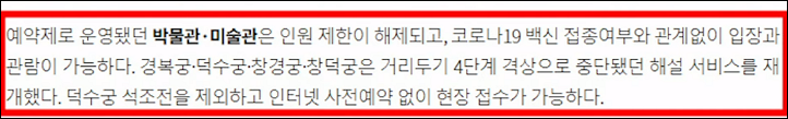 헬스장, 태권도장을 비롯해서 모든 실내 체육시설은 운동기구 속도 및 영업시간 제한이 해제됐고, 샤워실 이용도 가능해졌습니다. 영업시간이 제한되던 식당 카페 모두 24시간 영업이 가능해졌고요, 접종 미완료자는 최대 4인까지 합류할 수가 있는데요, 사적 모임 인원 확인을 위해서는 접종 증명서가 꼭 필요합니다. 예약제로 운영되던 박물관 미술관은 인원 제한이 해제가 되었고, 코로나19 백신 접종 여부와 관계없이 입장과 관람이 가능해졌습니다. 위드 코로나와 맞춰서 영화, 전시, 실내 체육시설, 스포츠, 숙박, 여행, 공연 총 7개 분야에서 소비 할인권도 지원하는 혜택을 보실 수가 있는데요, 영화관 같은 경우에는 1주당 1인 2매씩 6천 원 할인권을 받을 수가 있고, 전시는 예매처 별로 1인당 내에 최대 5천 원 할인권을 지원받을 수가 있습니다.