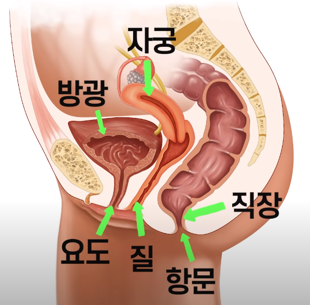 여성이 방광염에 걸리기 쉬운 두 번째 이유는 요도의 위치 때문인데요, 그림에서 보이듯이, 앞에 있는 건 방광, 그 밑으로 요도가 이어지고요, 중간에 있는 건 자궁, 이건 질로 연결됩니다. 뒤에 있는 건 직장이고요, 항문으로 연결되죠. 여성들은 요도, 질, 항문, 이 세 가지 출입구가 다 가까운 데 모여있어요.