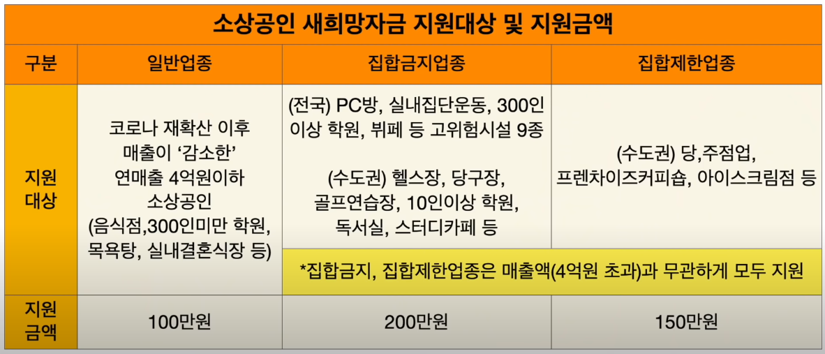 그리고 일반 업종은 코로나 재확산 이후 매출이 감소한 소상공인만 지급해주는데요, 기존의 연매출이 4억 원 이하여만 100만 원을 지급해 줍니다.