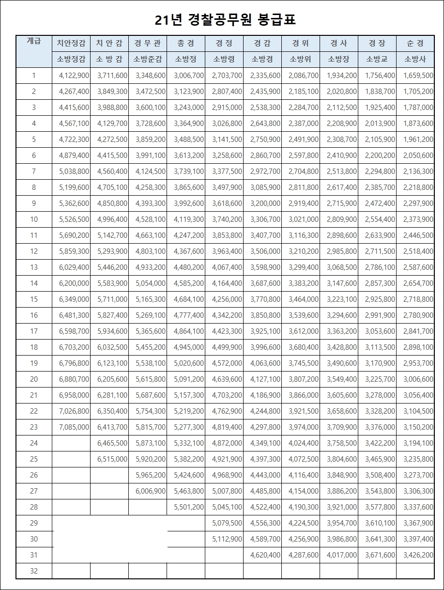 이제 올해 2022년부터 봉급 표가 달라지는데요, 2021년에 비해 1.4%가 오른 2022년 경찰공무원 봉급표가 어떻게 달라지는지 보겠습니다.