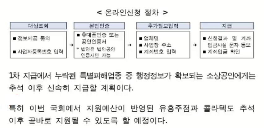 대부분 정부가 보유하고 있는 행정정보, 즉 국세청의 정보로 판단을 하기 때문에 영업제한 또는 집합 금지를 받은 특별 피해 업종의 경우에는 업종과 국세 코드가 일치하지 않고 지자체마다 영업제한, 집합 금지, 이런 부분을 상이하게 적용하는 경우가 많기 때문에 한꺼번에 지급하는 데는 어려움이 있고, 좀 늦어질 수도 있다고 합니다.